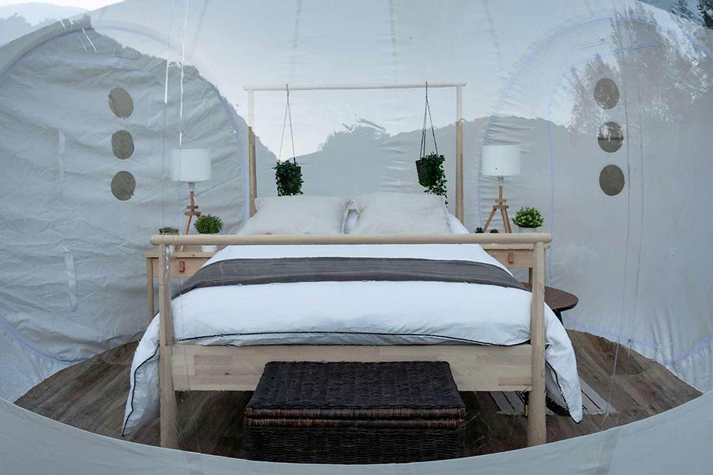 Instalaciones: Cada burbuja está equipada con un baño completo (lavabo, WC y bañera), aire acondicionado, calefacción, y una cama doble. Además, cuentan con un jardín privado donde se puede disfrutar de una cena a la luz de la luna. (nomadingcamp.com, nomadingcamp.com)